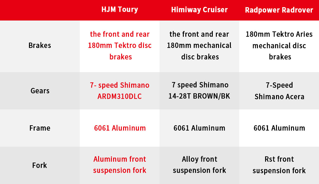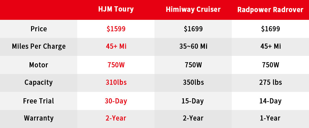 HJM produces electric bicycles with high-cost performance, high quality, powerful function, and beautiful appearance. It will become a powerful assistant for your daily work and save you money and energy cost. Not only that, HJM also provides a 2-year warranty (which is twice that of many of our competitors) and a 30-day free trial. These factors make Toury your first choice in this comparison.If this is still not enough to impress you, you might as well try to check our customer comments and see the guests' views and satisfaction with our Toury. For more information about HJM Toury, please check our official website: www.hjmbike.com.