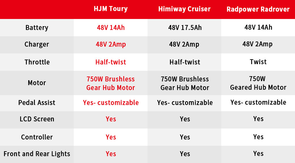 Now let us compare HJM Toury with Himiway Cruiser and Radpower Radrover.